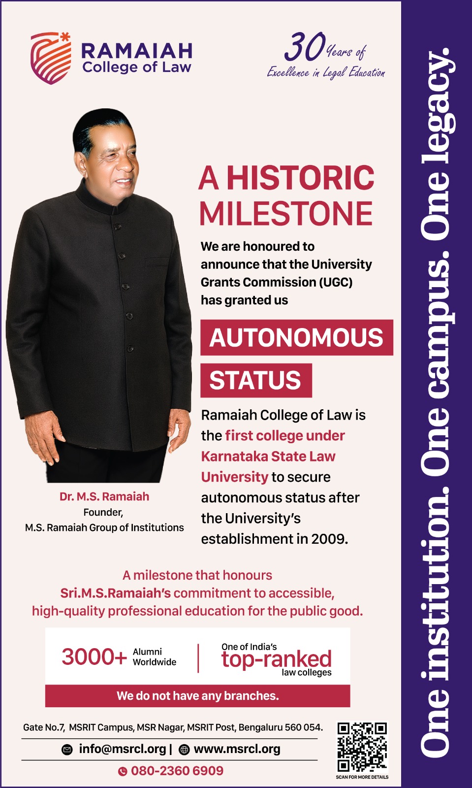 The prestigious Ramaiah College of Law (formerly, M. S. Ramaiah College of Law), which bears testimony to the sagacity and visionary zeal of our beloved founder Dr. Late Sri.M.S.Ramaiah was established in 1995 with the approval of Bar Council of India. It added one more feather to the cap of M.S.Ramaiah Group of Institutions.